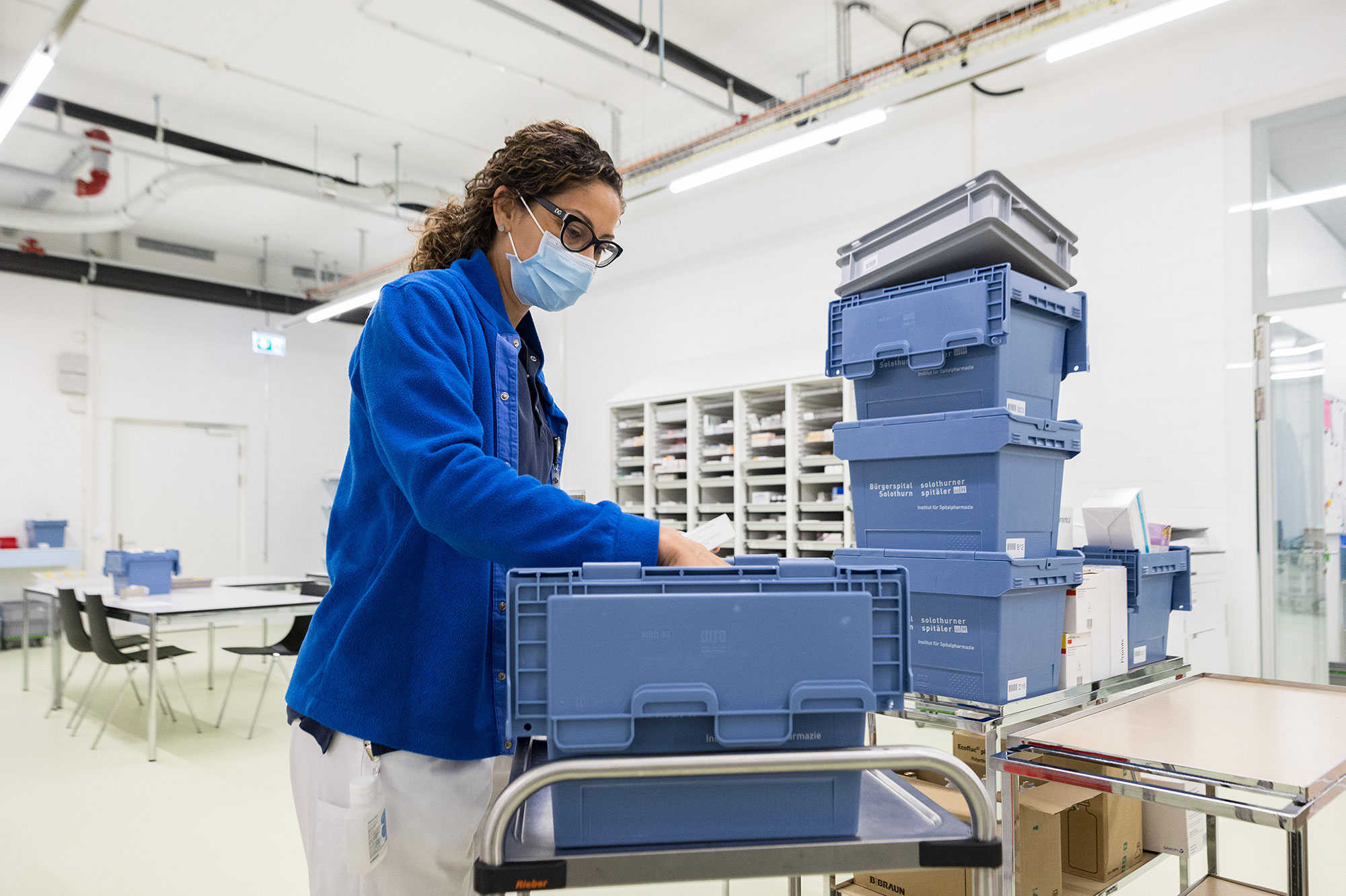 «Wir sind eine Dienstleistungsabteilung. Unsere Kundinnen und Kunden, in diesem Fall Mitarbeitende der Notfallzentren, sollen zufrieden sein mit unseren Leistungen», sagt. Dr. pharm. Marco Greusing, Chefapotheker der Solothurner Spitäler. Im Neubau des Bürgerspitals Solothurn rüstet in der Apotheke seit Kurzem ein Roboter die Medikamente, die Bestellung funktioniert nur noch online. Marco Greusing ist begeistert vom neuen Helfer, der präzise und mit hoher Geschwindigkeit arbeitet. «Und trotzdem bleibt die Kommunikation zwischen Notfall und Apotheke der wichtigste Faktor für eine gute Zusammenarbeit.» Deshalb ist auch regelmässig eine Mitarbeiterin oder ein Mitarbeiter der Spitalapotheke auf der Notfallstation, füllt die Schränke auf und tauscht sich aus. Nur so erfahre man, wo möglicherweise ein Prozess optimiert werden müsse.