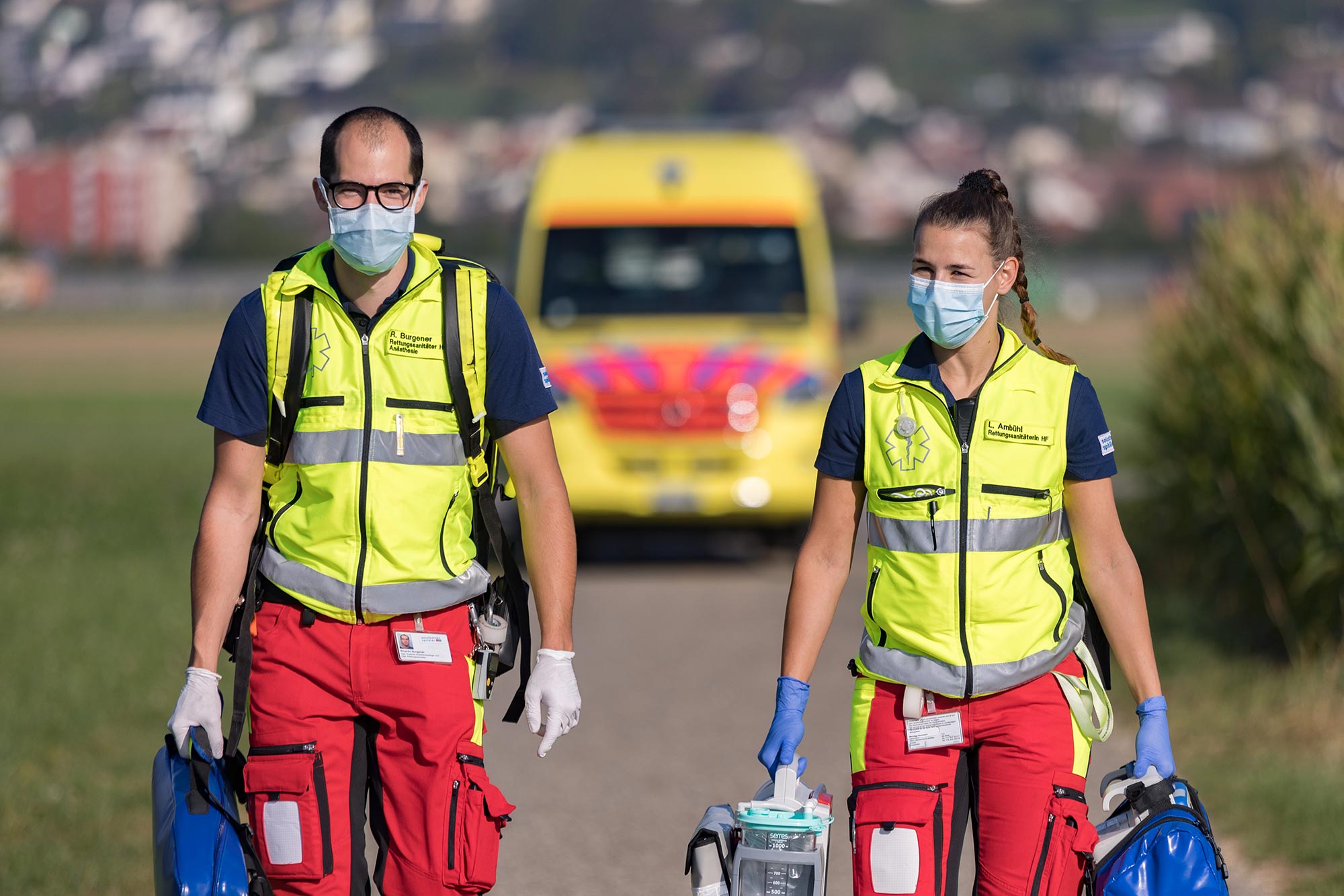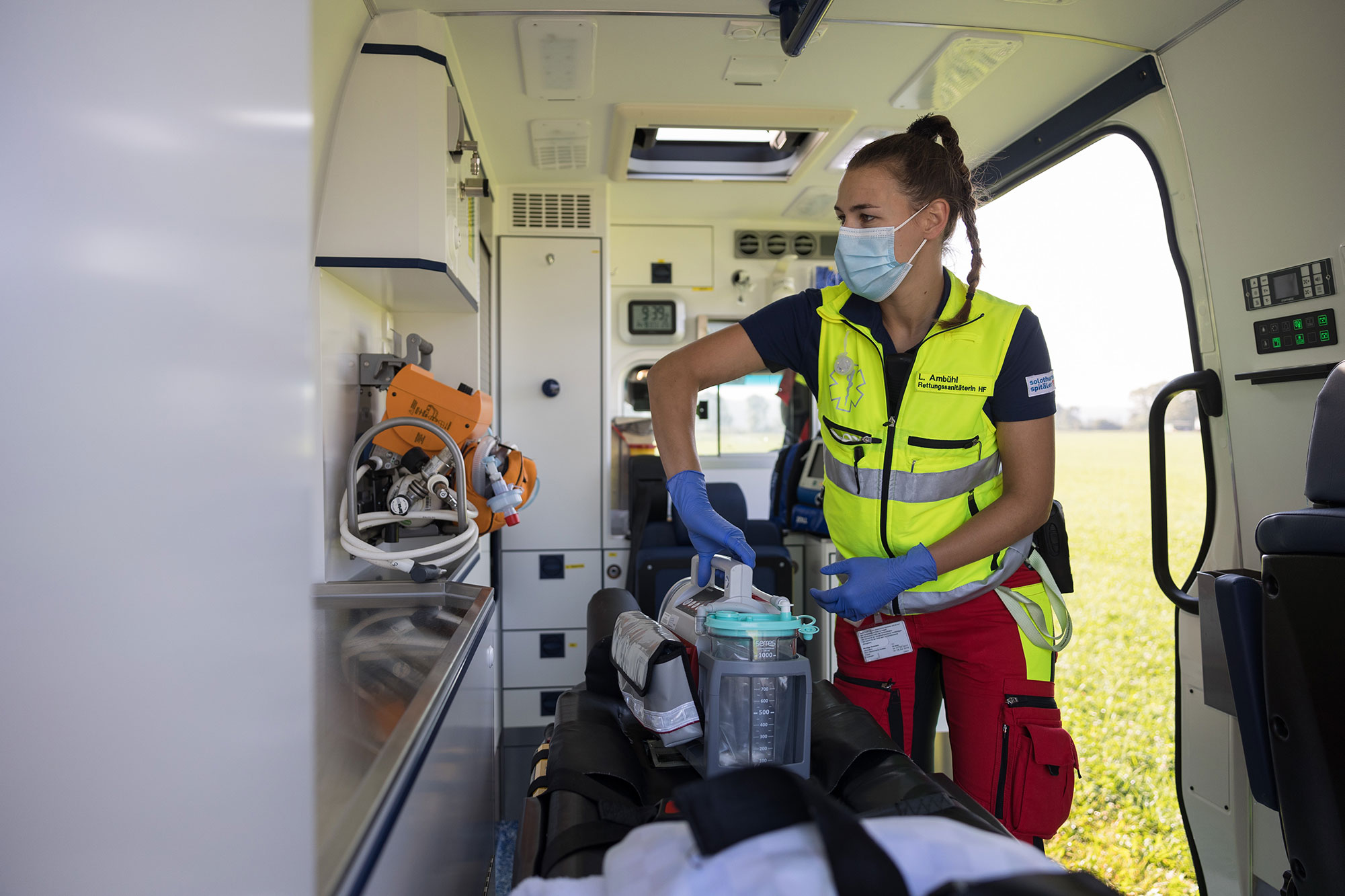Das Mädchen weint heftig, das Gesicht voller Blut. Die Mutter erklärt, dass es mit dem Velo in eine Strassenlaterne geprallt sei. Lea Ambühl und Ricardo Burgener nehmen das Mädchen auf die Bahre, beruhigen es, arbeiten routiniert, präzis, konzentriert. Die Wunde – eine Platzwunde auf dem Nasenrücken – wird gereinigt, es werden Puls und Blutsauerstoff gemessen, neurologische Reflexe geprüft, der Körper nach Frakturen abgetastet. Ricardo Burgener gibt dem Mädchen einen Rettungsteddybär. Das beruhigt – und lenkt vor allem ab.